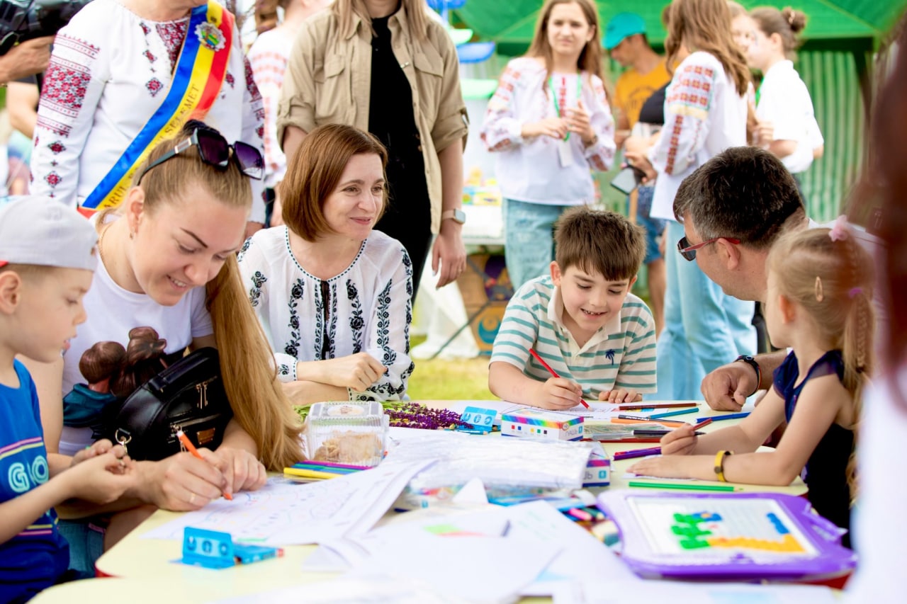 Maia Sandu este însoțită de pază, chiar și atunci când stă de vorbă cu copiii.