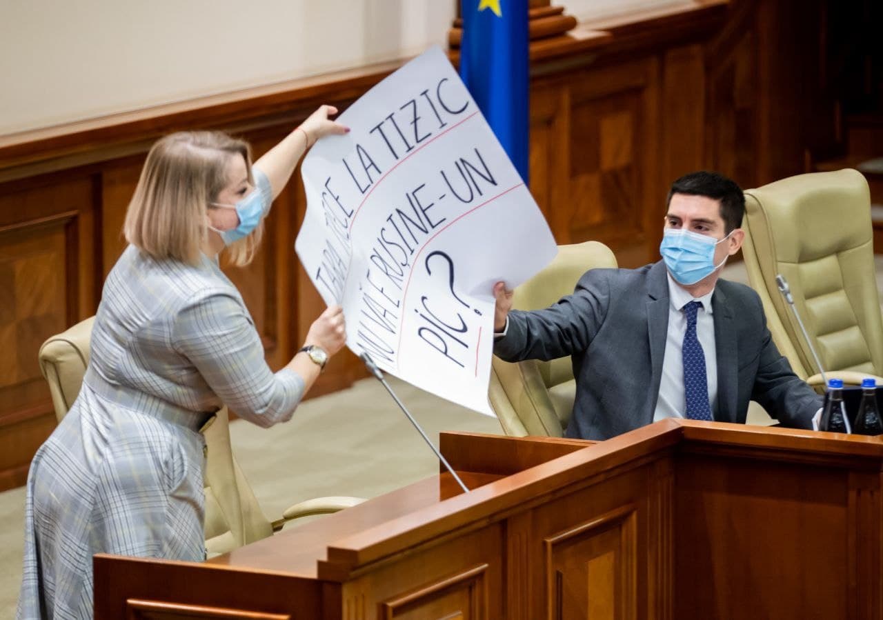 ”Domnul Popșoi, în lupta contra creșterii tarifelor la gazele naturale, dumneavoastră ați pierdut posterul, eu l-am găsit, și cu mare drag vreau să vi-l întorc ca să continuați lupta, căci astăzi este și mai actual decât ieri”, a declarat Caraman, înmânându-i vicespeakerului posterul în cauză.
