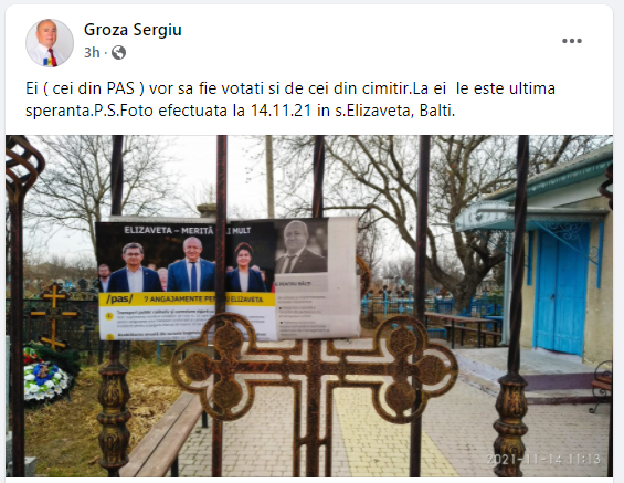 ”Ei (cei din PAS) vor să fie votați și de cei din cimitir. La ei le este ultima speranță. Fotografia a fost efectuată la data de 14 noiembrie 20211 în satul Elizaveta din Bălți”, scrie Sergiu Groza pe Facebook.