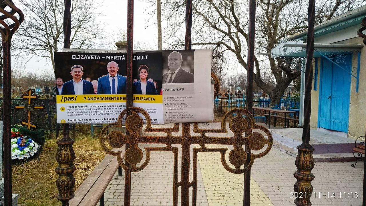 ”Ei (cei din PAS) vor să fie votați și de cei din cimitir. La ei le este ultima speranță. Fotografia a fost efectuată la data de 14 noiembrie 20211 în satul Elizaveta din Bălți”, scrie Sergiu Groza pe Facebook.