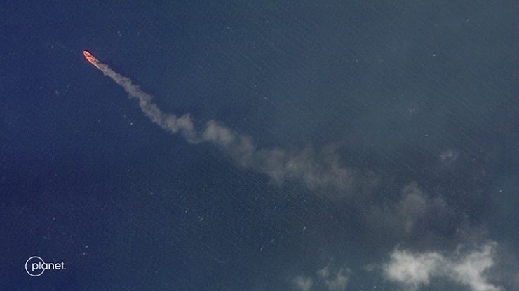 Planet Labs PBC a anunțat că a colectat marți o nouă imagine prin satelit care arată un val mare de fum negru care iese din navă, nor de fum care plutește la aproximativ 20 de mile (32 de kilometri) la est de orașul ucrainean Odesa.