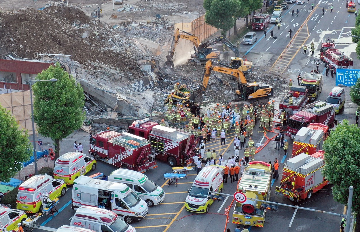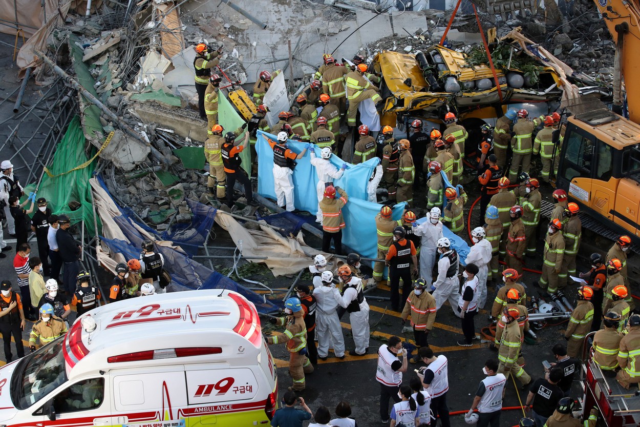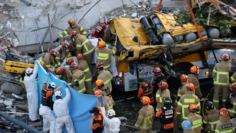 Incidentul s-a petrecut în orașul Gwangju, la 270 de kilometri de Seul, iar autobuzul staționa în acel moment și a fost îngropat în moloz. Alți 25 de oameni au fost răniți, iar opt persoane se află în stare gravă, a anunțat Ministerul de Interne.