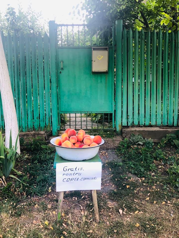 Un gest frumos din partea unei familii din satul Porumbeni, raionul Criuleni. Gospodarii au scos la poartă un coș mare cu piersici pe care le oferă gratis copiilor cuminți.