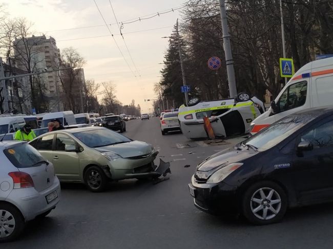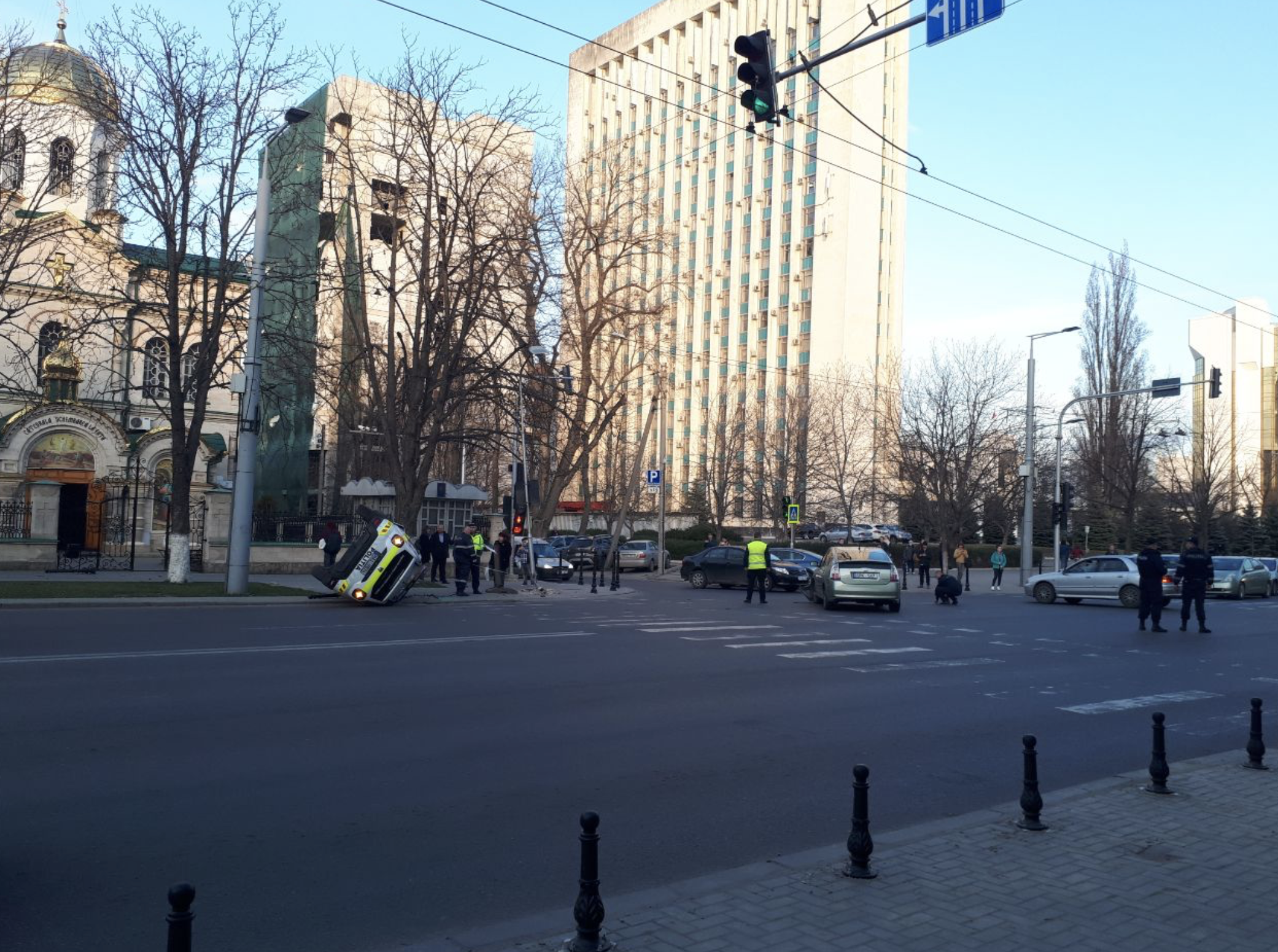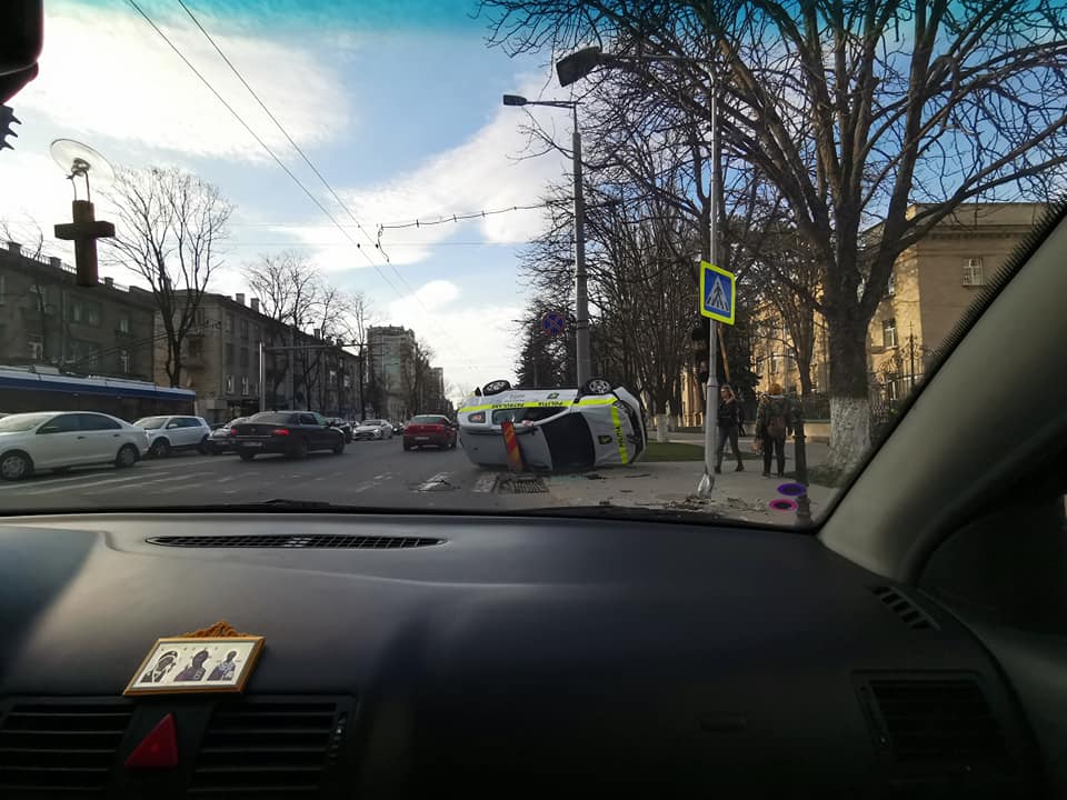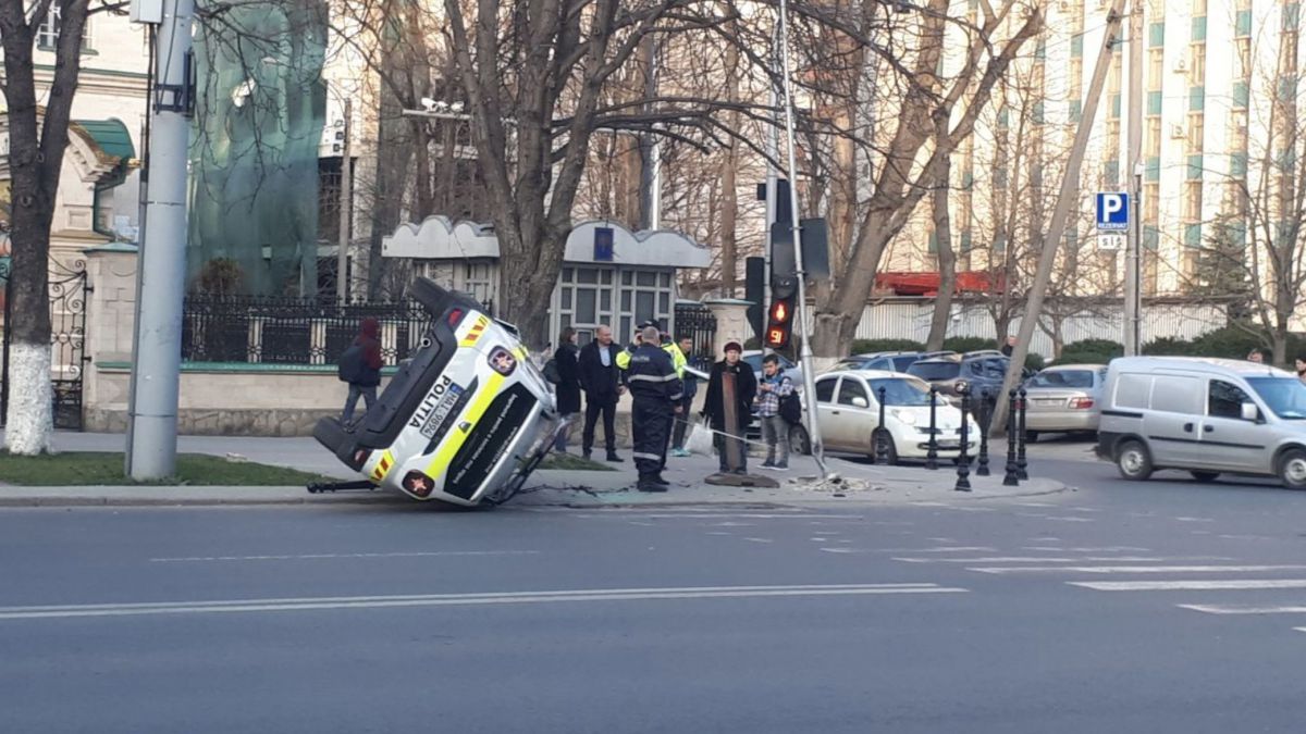 O mașină de teren a poliției s-a inversat în urma ciocnirii cu un alt autovehicol. Impactul a avut loc la intersecția străzilor Ștefan cel Mare cu Serghei Lazo din orașul Chișinău.