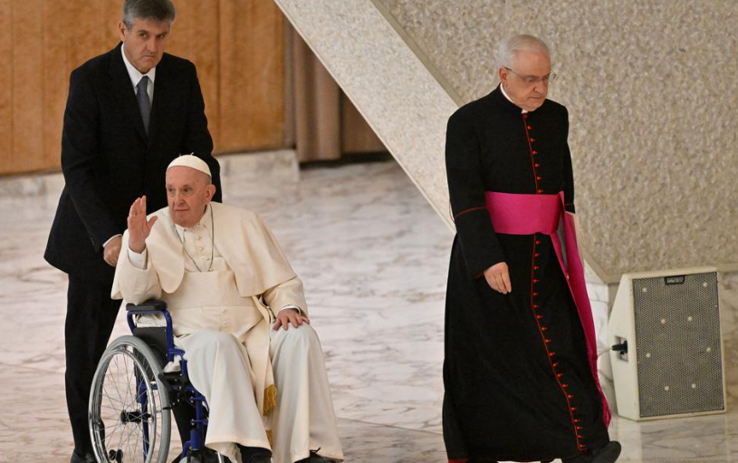Papa Francisc a apărut în public, joi, într-un scaun cu rotile, pentru prima dată de când durerile la genunchi s-au agravat.