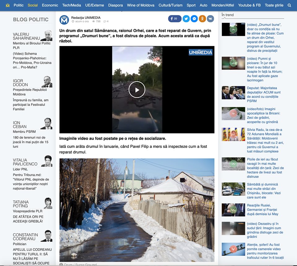 Prim-ministrul Republicii Moldova a publicat pe pagina sa de Facebook un mesaj în care a acuzat portalul de știri Unimedia de publicarea știrilor false. Acesta s-a referit la un drum afectat de ploi în localitata Sămănanca, care în viziunea celor de la unimedia a fost reparat în cadrul programului Drumuri Bune, când de fapt, acesta a este un drum vechi.