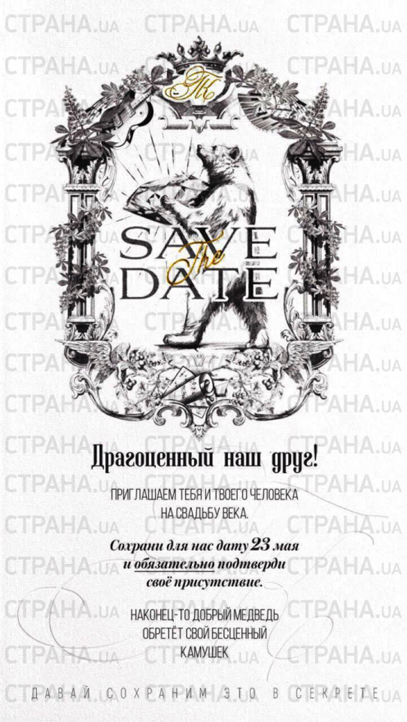 „În sfârșit ursul bun și-a găsit pietricica scumpă (n.r. numele Kamenskih provine de la cuvântul piatră). Dar haideți să păstrăm acest lucru în secret”, se spune în invitație.