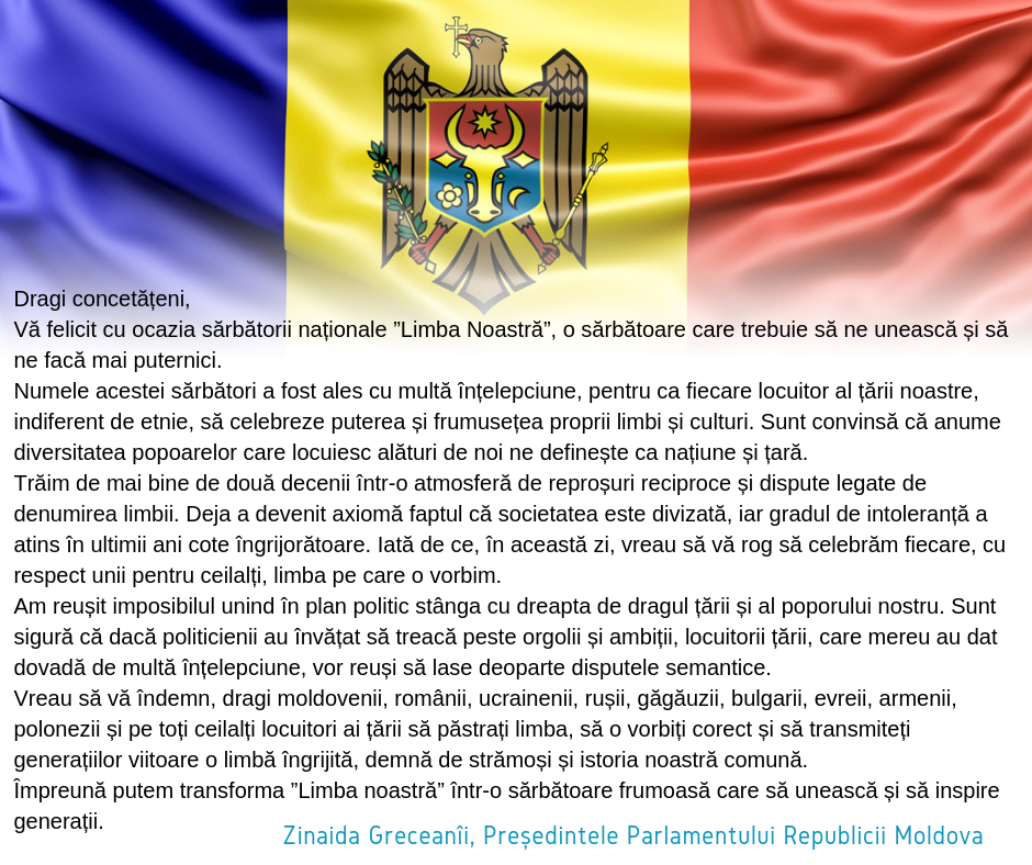 Președintele Parlamentului Republicii Moldova, Zinaida Greceanîi a venit cu un mesaj de felicitare pentru toți moldovenii cu ocazia sărbătorii naționale… Limba Noastră, spunând că numele acestei sărbători, a fost ales cu o înțelepciune, pentru ca fiecare locuitor al țării, indiferent de etnie să celebreze puterea și frumusețea acestei limbi.