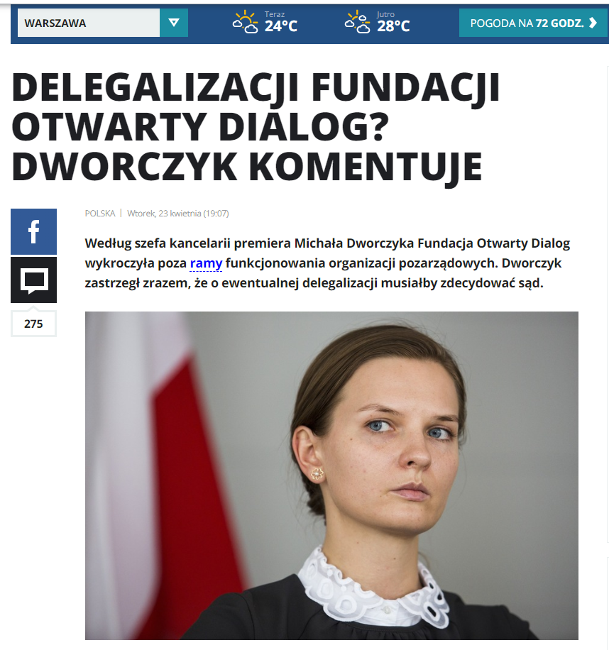 A treia sursă pe care am cercetat-o noi, a fost Interia Fakty. Aceștia au dat reacția șefului cancelariei prim-ministrului, Michał Dworczyk. Oficialul declară că Open Dialog a ieșit în ultima vreme din postura de ONG, luând asupra sa prea multe. Mai mult de atât, Dworczyk spune că judecata trebuie să ia măsuri importante împotriva acestei organizații, pentru a interzice activitatea acestuia pe teritoriul polonez. Oficialul polonez spune că Open Dialog a devenit dintr-un ONG, o organizație cu o activitate asemănătoare unui partid politic.