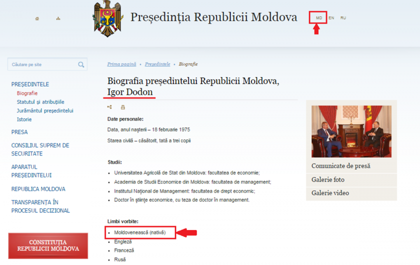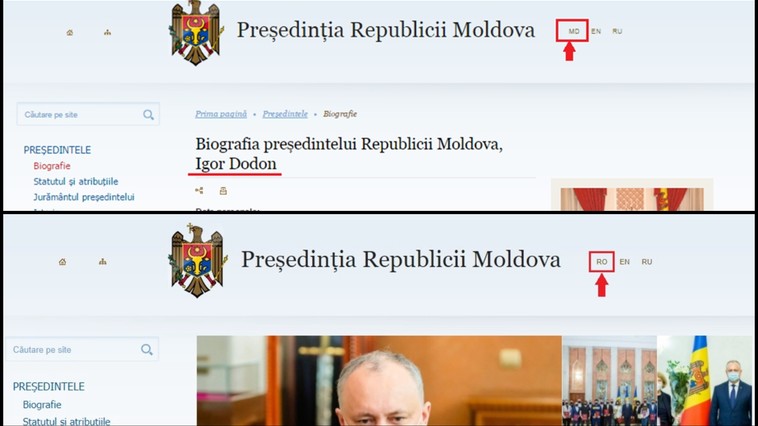 Limba de acces pe site-ul președinției a fost schimbată în moldovenească de către Igor Dodon la preluarea mandatului său de președinte în 2016.