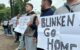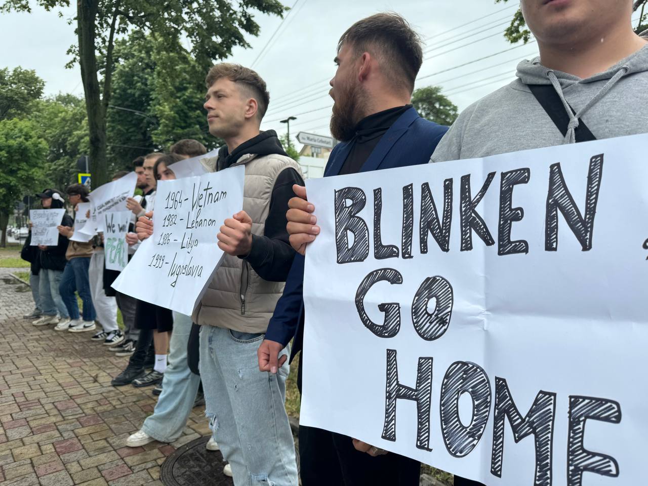 Tinerii au afișat bannere prin care i-au transmis lui Blinken să se întoarcă acasă, cu mesaje precum „Blinken, go home”, „No NATO, NO problems” și „Hands off Moldova”. În timpul protestului, aceștia s-au stropit cu o soluție lichidă de culoare roșie, simbolizând sângele vărsat în războaiele susținute de americani în diverse țări: Vietnam – 1964; Liban – 1982; Libia – 1986; Iugoslavia – 1999.