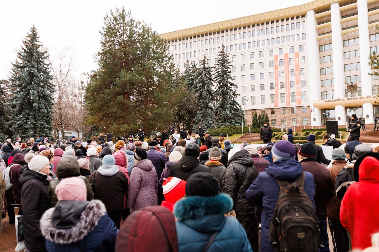 „Am venit astăzi, la Parlament, pentru a spune NU acestei guvernări incompetente. Imediat ce a ajuns la putere și-a satisfăcut poftele. Guvernul amatorilor de pizza a aprobat în grabă, cu încălcarea flagrantă a legislației Republicii Moldova, proiectul bugetului de stat pentru 2023. Miniștrii și-au majorat salariile cu aproape 7.000 de lei, iar poporul este lăsat în întuneric, frig și foame. Totodată, salariile profesorilor vor crește cu doar 300 de lei. Noi vrem salarii majorate pentru întreg sistemul bugetar. Vrem lefuri mai mari pentru medici, pensii mai mari și indemnizații unice de 10 mii de lei pentru fiecare familie, ca să poată face față vremurilor dificile în care trăim. Vrem ca energia electrică să fie de 1,51 lei pentru un kilowatt-oră, așa cum a fost, nu de 5,91 lei, cum este acum. Vrem ca un metru cub de gaze naturale să coste 4 lei, nu 30 de lei!”, a spus viceprimarul orașului Orhei, Cristina Cojocaru, care a vorbit în numele a zeci de cetățeni care s-au plâns că nu au din ce trăi și achita facturile.