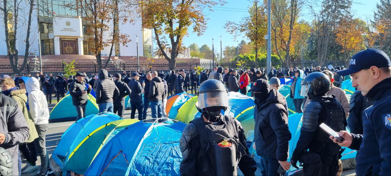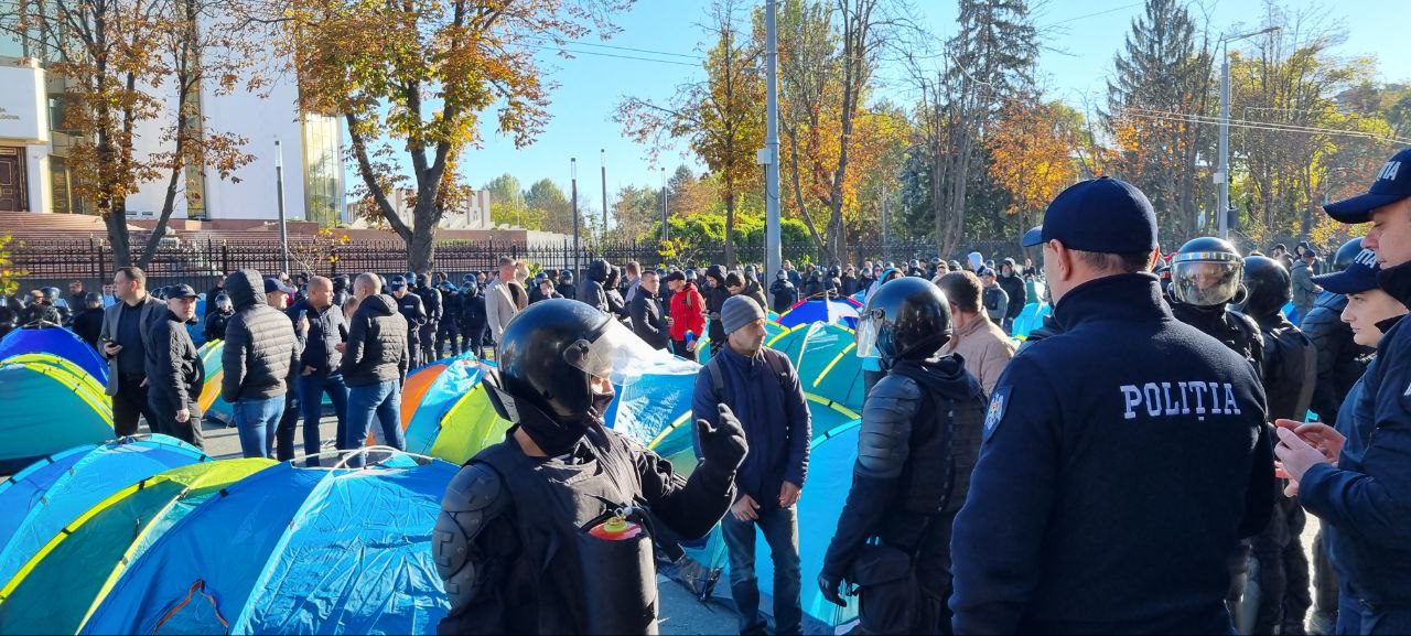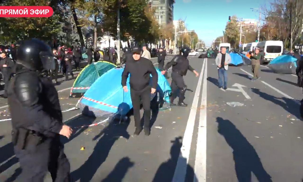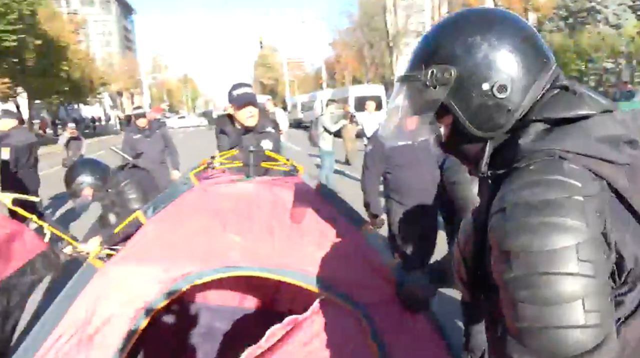 Intervenție în forță a poliției contra protestatarilor care și-au instalat corturi pe bulevardul central din capitală, între Parlament și Președinție. Sute de mascați de la trupele cu destinație specială „Fulger” au smuls corturile și au obligat lumea să se retragă de pe carosabil. Asta deși organizatorii manifestației au notificat Primăria, așa cum prevede legislația, și protestau în mod pașnic.