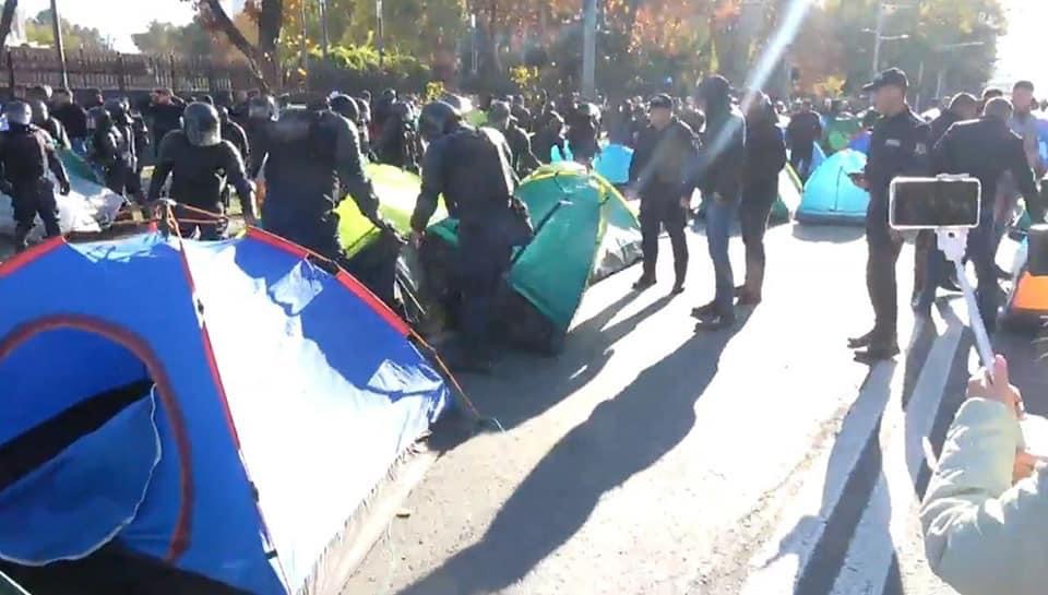 Intervenție în forță a poliției contra protestatarilor care și-au instalat corturi pe bulevardul central din capitală, între Parlament și Președinție. Sute de mascați de la trupele cu destinație specială „Fulger” au smuls corturile și au obligat lumea să se retragă de pe carosabil. Asta deși organizatorii manifestației au notificat Primăria, așa cum prevede legislația, și protestau în mod pașnic.
