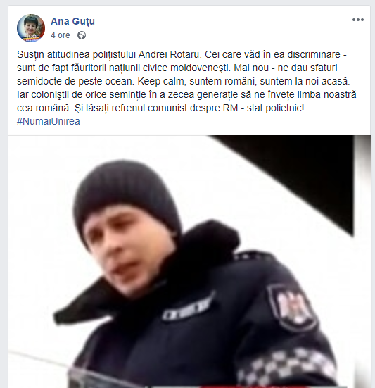 Spre exemplu, Ana Guțu a scris că susține atitudinea polițistului Andrei Rotaru: „Cei care văd în ea discriminare – sunt de fapt făuritorii națiunii civice moldoveneşti. Mai nou – ne dau sfaturi semidocte de peste ocean. Keep calm, suntem români, suntem la noi acasă. Iar coloniştii de orice seminție în a zecea generație să ne învețe limba noastră cea română. Şi lăsați refrenul comunist despre RM – stat polietnic!”.