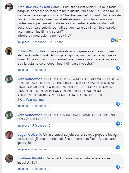 Acestea sunt doar câteva dintre sute de comentarii care s-au adunat la postarea fostei doamne Filat. Spre exemplu ex-ministrul al Jusției, Stanislav Pavlovschi, învestit în funcție de alianța ACUM-PSRM, a scris că Vlad Filat singur este vinovat că atunci când a fost la guvernare nu a făcut reforme în justiție, iar acum culege roadele.