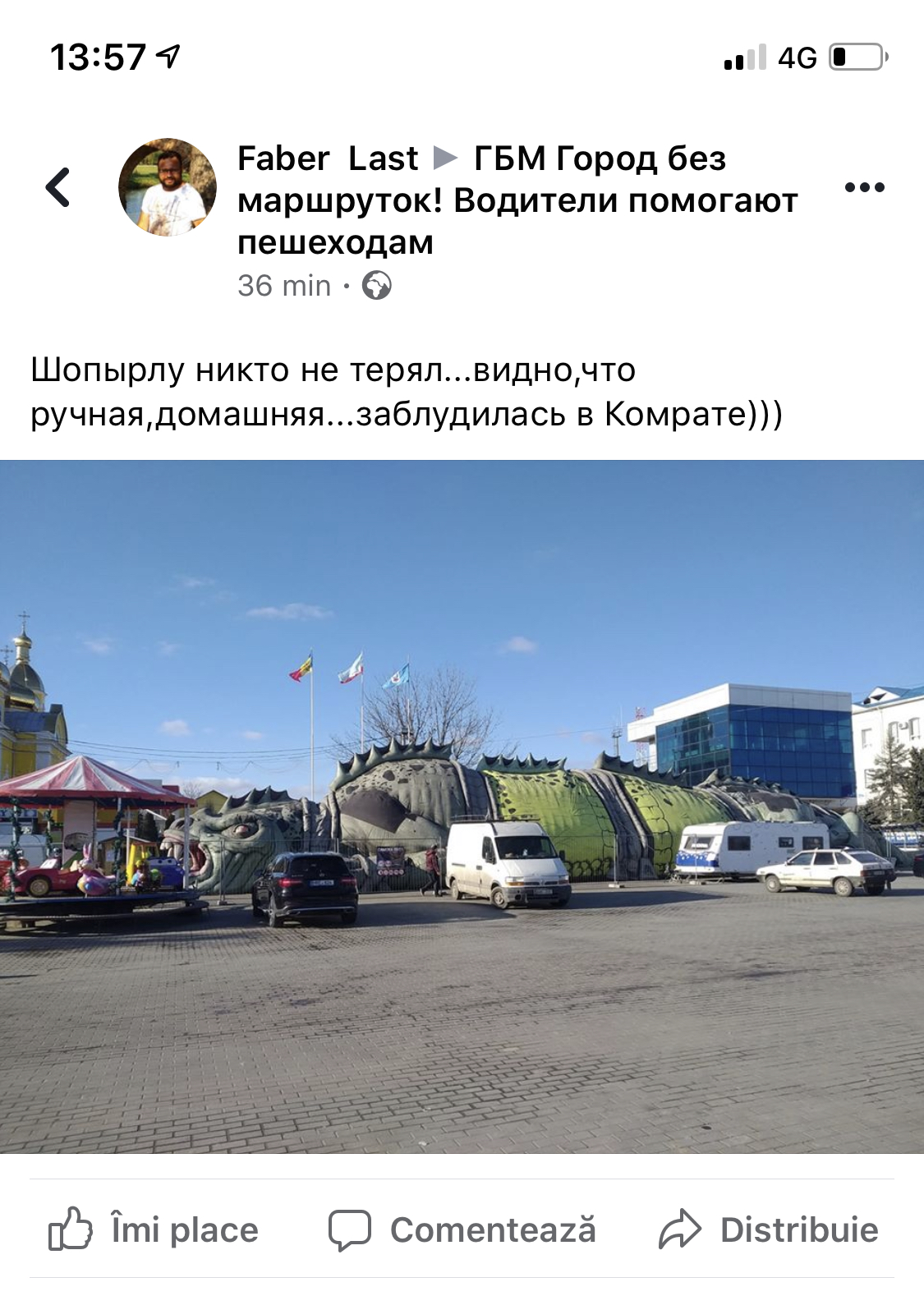 Hidoasa reptilă a fost instalată inițial în PMAN, apoi la solicitarea Primarului General, Ion Ceban, a fost demontată. Ulterior reptila a fost văzută lângă Circul din Chișinău, iar astăzi, internauții au postat poze cu aceasta în centrul municipiului Comrat.