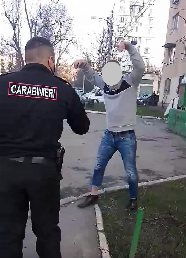 O patrulă de carabinieri din cadrul Direcției regionale Centru a IGC, ce asigura ordinea publică în zonă, a stopat bărbatul nestăpânit, îndemnându-l să înceteze acțiunile sale ilegale. Insul a devenit și mai agresiv când a văzut oamenii legii. Acesta s-a năpustit asupra unui carabinier cu pumnii și ulterior a scos din buzunar o foarfecă, având intenția de a-l străpungă în zona capului. Carabinierii au fost nevoiți să aplice forța fizică și mijloacele speciale pentru a-l imobiliza pe agresor.
