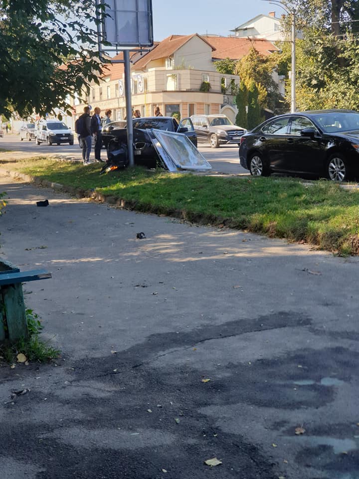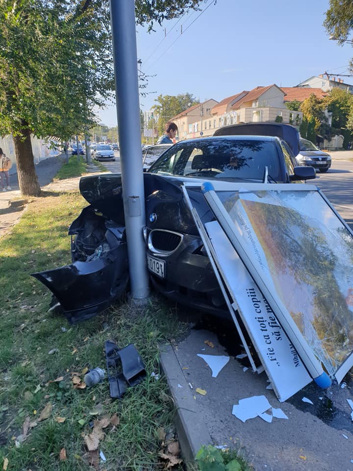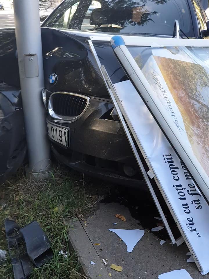 Din imagine vedem că BMW-ul a dărămat un panou publicitar oprindu-se într-un stâlp.