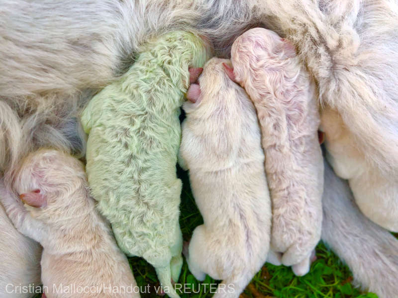 Fermierului italian Cristian Mallocci nu îi venea să creadă că ceea ce vedea era adevărat atunci când căţeluşa lui Spelacchia, unul dintre cei opt câini ai lui, a născut un căţel cu blană verde.