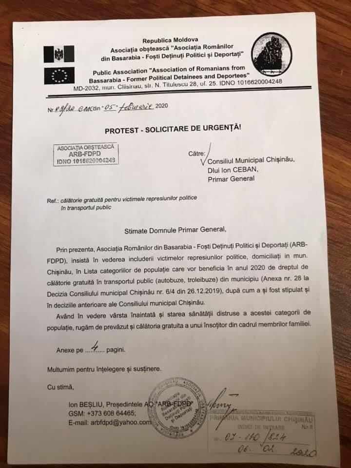 „Asociația Românilor din Basarabia – Foști Deținuți Politici și Deportați” cere autorităților municipale să repună în drepturi victimele represiunilor politice și să le asigure și în anul 2020 acces gratuit la călătoriile în transportul public. O fotografie a solicitării emise în acest sens către Primăria Chișinău a fost publicată pe facebook de consilierul Partidului Unității Naționale în Consiliului Municipal Chișinău, Corneliu Pântea.