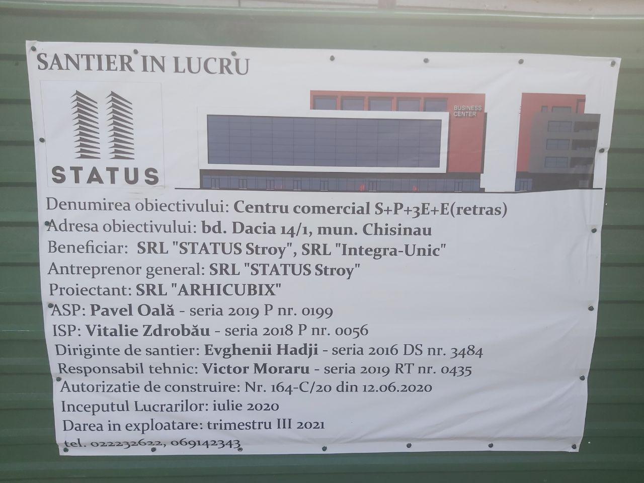 Conform datelor de la „Cadastru”, terenul de pe bd. Dacia, 14/1, are o suprafață de 0,161 ha, iar autorizația de construcție a fost eliberată de Primăria municipiului Chișinău la data 12 iunie.