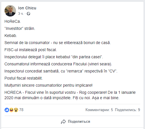 „Inspectorului delegat îi place kebabul „din partea casei”. Consumatorul informează conducerea Fiscului (vineri seara). Inspectorul este concediat sâmbătă, cu „remarca” respectivă în „CV”. Postul fiscal a fost restabilit. Mulțumiri sincere consumatorilor pentru implicare!”, a menționat Chicu în postarea sa.