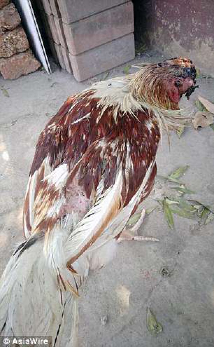Imaginile arată un pui de găină al cărui cap a fost înlocuit de un ciot însângerat. Pasărea continuă, însă, să meargă.