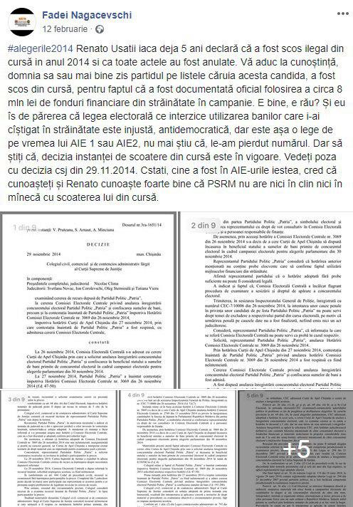 La o postare publicată la data de 12 februarie, în ajunul alegerilor parlamentare, juristul Nagacevschi a publicat un mesaj, a cărui scop presupunem este convingerea lui Renato Usatîi să ofere susținere PSRM-ului, scrie că în 2014, când a fost luată decizia cu privire la excluderea din alegeri a lui Renato Usatîi și a partidului politic „Patria”, la guvernare era alianța pentru integrare europeană, exponenții căreia se regăsesc acum în blocul ACUM și PDM.