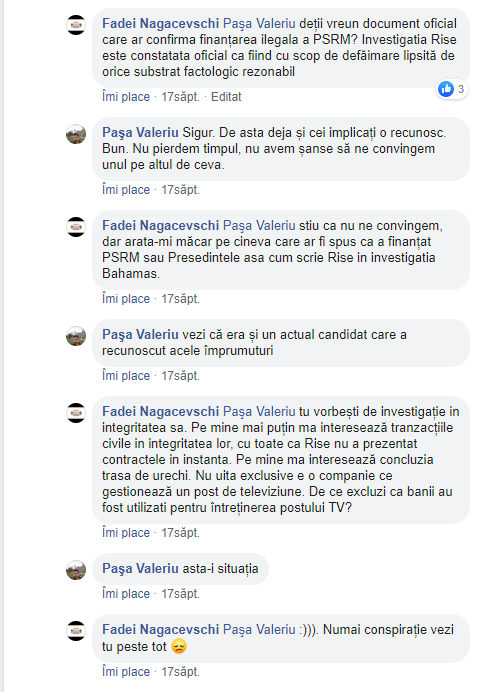 Juristul PSRM-ului a spus că portalul de investigații RISE Moldova a avut drept scop să ponegrească partidul socialiștilor și anume din acest motiv și a făcut acest material cu privire la finanțarea acestora prin unele firme off-shore din Bahamas. Cei doi au ajuns însă la concluzia că nu se vor putea convinge unul pe altul, spunând că mai bine ar fi să fie închisă dezbaterea, ca fiind una fără rezultat.