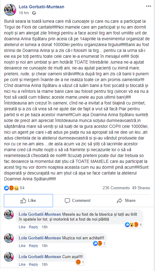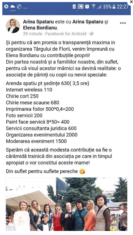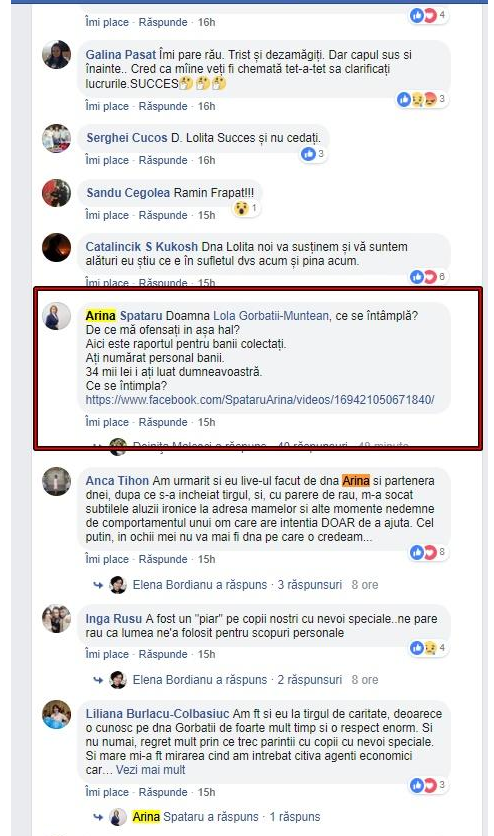 Firul roșu al tuturor celor relatate în acest material se regăsește în câteva postări făcute pe facebook de mămicile implicate în organizarea acestui eveniment, precum și în comentariile care însoțesc aceste postări. Tot acolo, apare în mai multe intervenții și Arina Spătaru care le învinuiește pe mămici de acuzații nefondate și denigrare orchestrată.