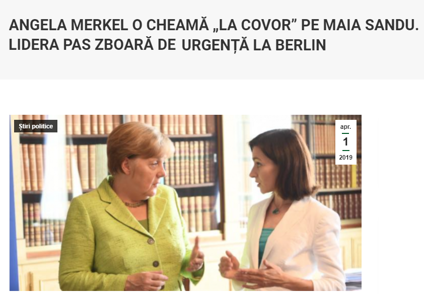 3. Portalul nostru de știri Telegraph.md a scris că „Angela Merkel a chemat-o de urgență pe Maia Sandu la covor”. Scopul plecării liderii PAS la Berlin ar fi pentru a primi indicații cu cine sa facă alianță blocul ACUM în Parlament. (vezi sursa)
