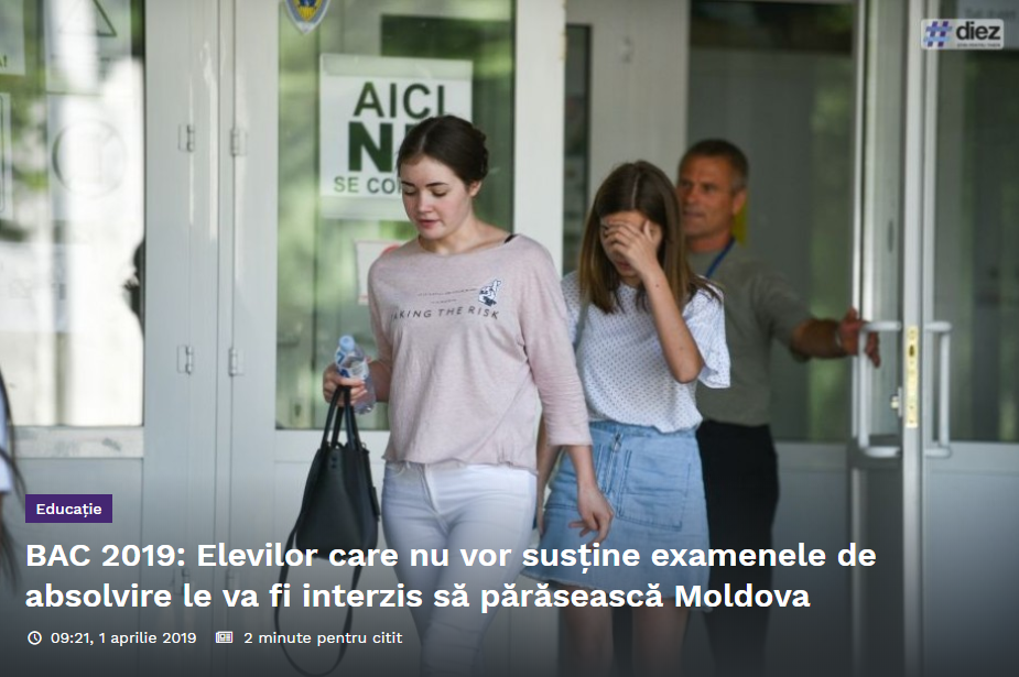2. Diez.md a scris că „Elevii care nu vor susține examenele de Bacalaureat le va fi interzis să părăsească Moldova”. După cum am urmărit pe Facebook, mulți tineri au luat în serios acest anunț și s-au cam stresat (vezi sursa)