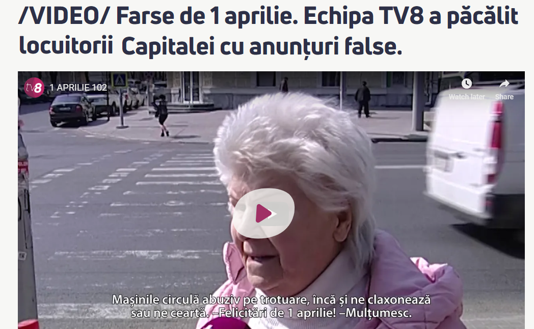 7. Un reporter de la TV8 la fel a mers în stradă și a comunicat diverse știri false oamenilor, apoi i-a rugat să le comenteze. Din câte am văzut lumea nu s-a prins că sunt glume de 1 aprilie (vedeți video)
