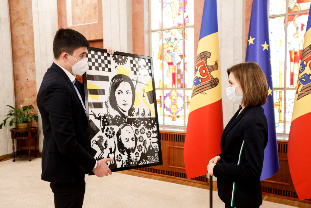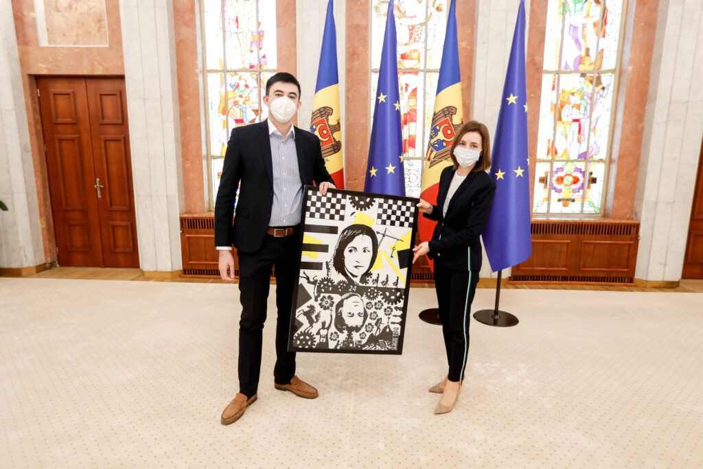 Președintele Republicii Moldova, Maia Sandu, l-a primit în vizită pe Sergiu Țopa, paramedic și artist grafic, care i-a prezentat șefului statului creația sa – un tablou inspirat din viața și activitatea domniei sale.