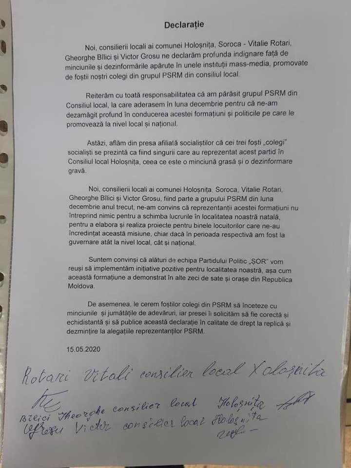 Ca să le ușurăm misiunea, le oferim jurnaliștilor linkul de pe pagina cec.md unde este scris negru pe alb cine sunt consilierii PSRM în satul Holoșnița.”, încheie Bătrâncea.