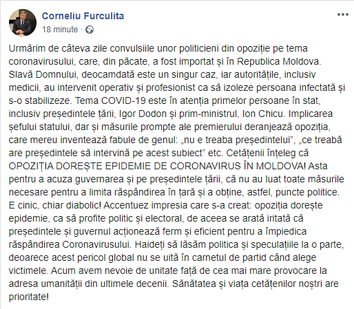 Deputatul socialist Corneliu Furculiță afirmă într-o postare pe facebook că opoziția din Moldova și-ar dori răspândirea infecției de COVID-19 în Republica Moldova.
