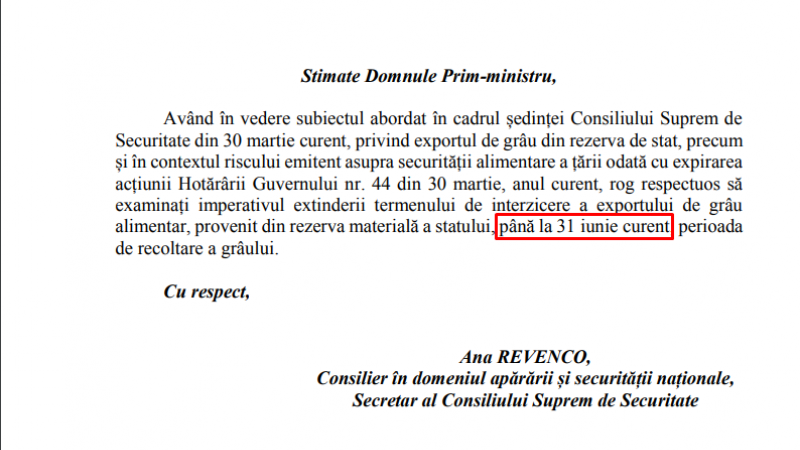 Potrivit documentului, solicitarea Președinției vine „în contextul riscului emitent (n.n. iminent) asupra securității alimentare a țării” și se cere să fie examinat „imperativul extinderii termenului de interzicere a exportului de grâu alimentar, provenit din rezerva materială a statului, până la 31 iunie curent, perioada de recoltare a grâului”.