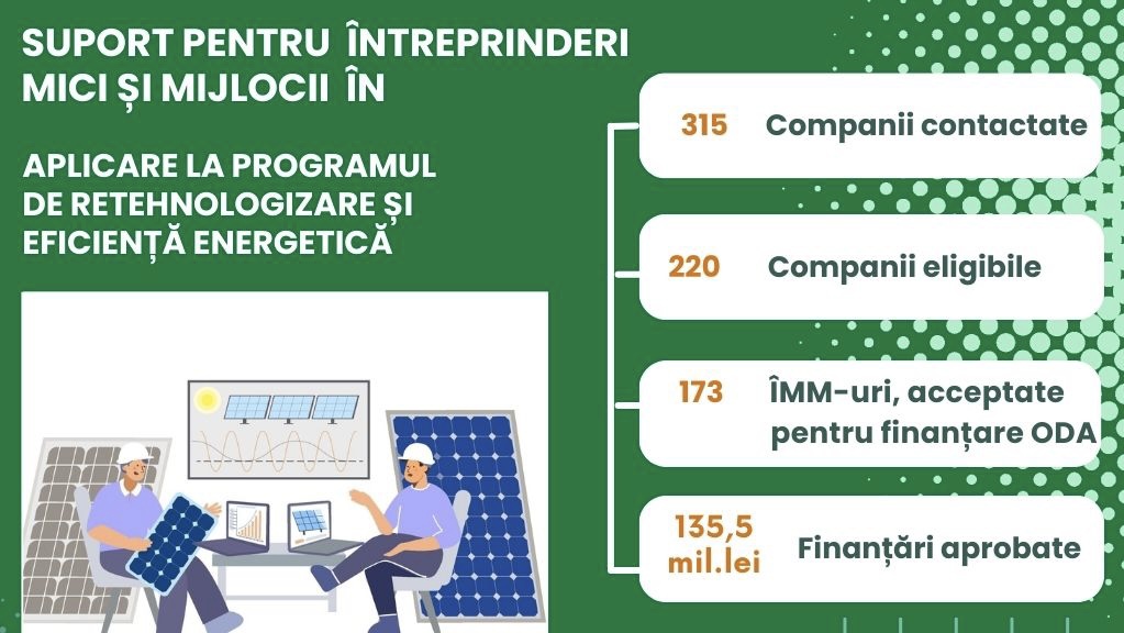 Această oportunitate oferă întreprinderilor mici și mijlocii din Moldova un suport nerambursabil semnificativ pentru a investi în tehnologii avansate și eficiență energetică. În perioada septembrie 2022 – august 2023, în cadrul programului de finanțări pentru Retehnologizare și Eficiență Energetică a ÎMM, au fost aprobate finanțări în valoare de 135,5 milioane de lei pentru 173 de întreprinderi mici și mijlocii. Granturile pentru implementarea proiectelor investiționale sunt acordate prin intermediul Organizației pentru Dezvoltare și Asistență (ODA).
