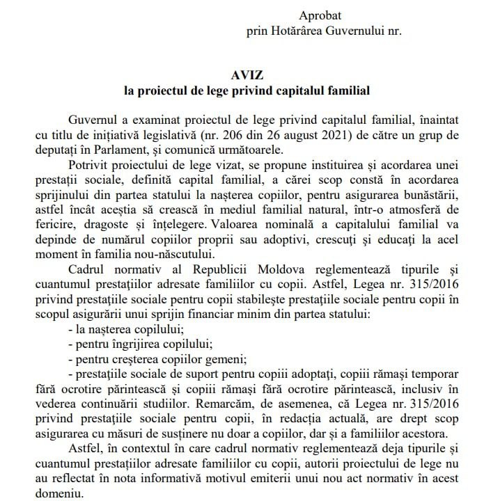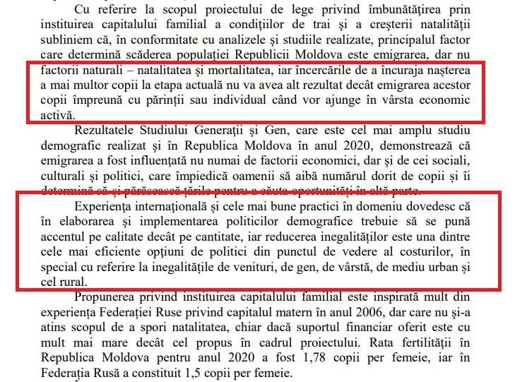 ”Cu referire la scopul proiectului de lege privind îmbunătăţirea prin instituirea Capitalului familial a condiţiilor de trai şi a creşterii natalităţii subliniem că, în conformitate cu analizele şi studiile realizate, principalul factor care determină scăderea populației Republicii Moldova este emigrarea, dar nu factorii naturali – natalitatea şi mortalitatea, iar încercările de a încuraja nașterea a mai multor copii la etapa actuală nu va avea alt rezultat decât emigrarea acestor copii împreună cu părinții sau individual când vor ajunge în vârsta economic activă”, se menționează în comentariul Executivului.
