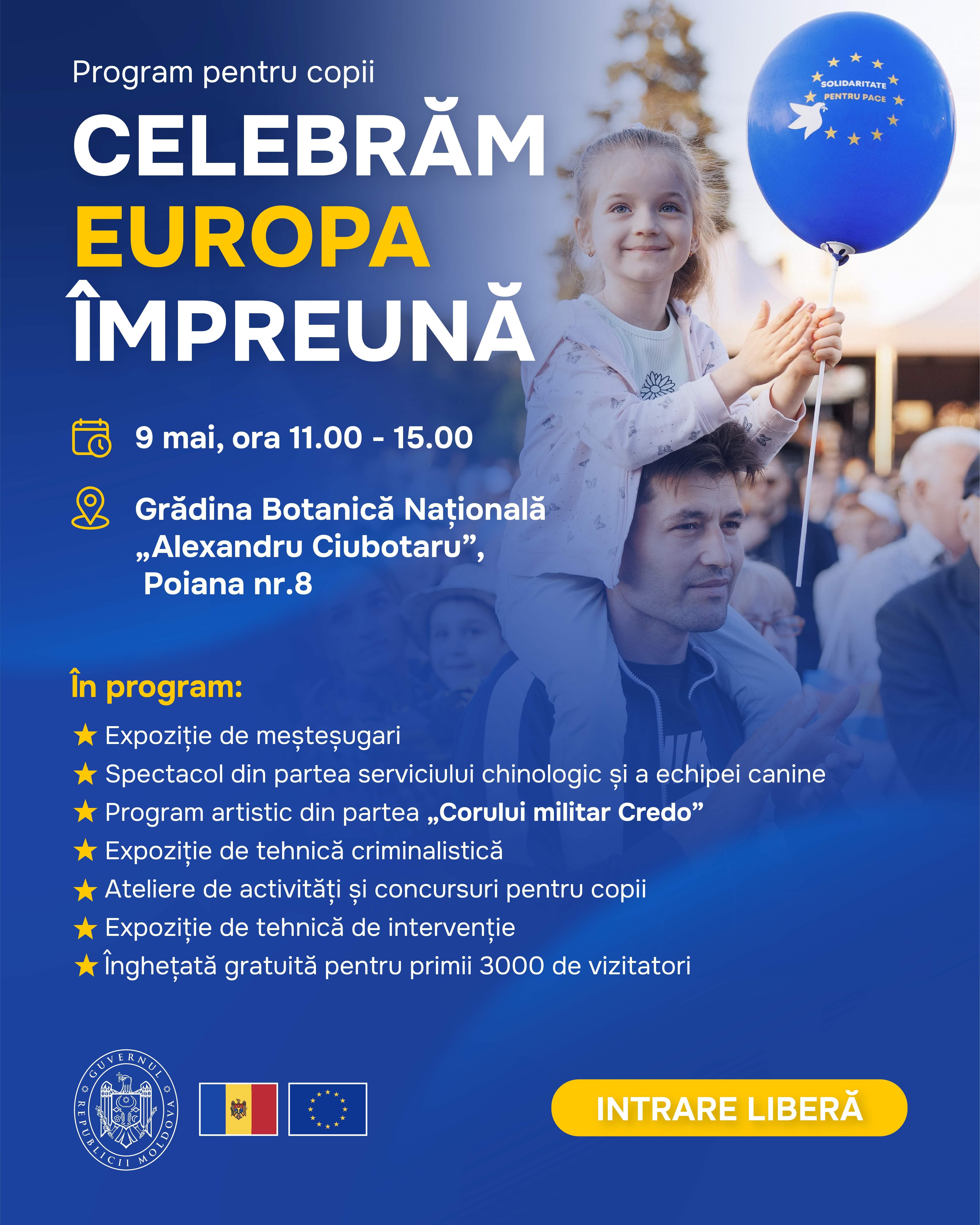 Guvernul Republicii Moldova organizează pe data de 9 mai, de la ora 11:00 până la ora 15:00, în Grădina Botanică Națională „Alexandru Ciubotaru”, programul pentru copii: „Celebrăm Europa împreună”.