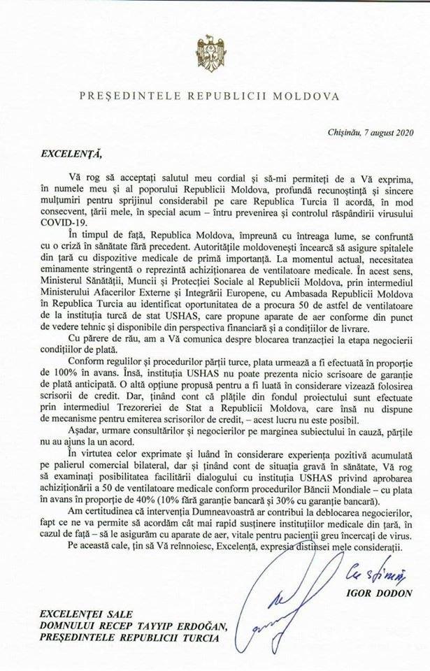 Astfel, cu această ocazie Igor Dodon aduce mulțumiri președintelui Republicii Turcia, Recep Tayyip Erdoğan care a acceptat ca aceste ventilatoare să fie livrate în țara noastră.