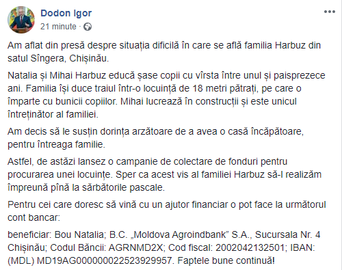 Igor Dodon, afirmă printr-o postare pe facebook, că a aflat despre situația dificilă a familiei Harbuz din satul Sângera, Chișinău.
