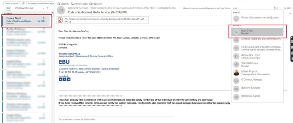 Președintele Parlamentului, Igor Grosu, a mințit, atunci când a spus că nu a primit scrisoarea directorului general al Uniunii Europene de Radiodifuziune, în care este criticată propunerea PAS de a modifica Codul serviciilor media audiovizuale din țara noastră. O dovadă în acest sens a fost prezentată de către deputatul socialist Adela Răileanu, vicepreședintele Comisiei parlamentare pentru cultură, educație, cercetare, tineret, sport și mass-media.