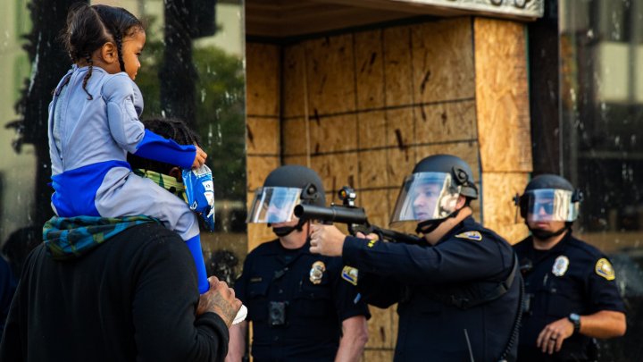Imagine şocantă suprinsă în timpul protestelor din SUA. Un copil, purtat pe umeri de un bărbat, privește cum un polițist stă cu o armă îndreptată în direcția ei, scrie a1.ro.