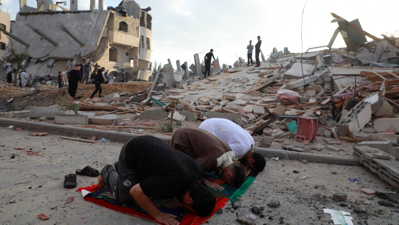 În fotografii, oamenii pot fi văzuți cum se roagă printre ruine, în urma celui mai intens conflict din Israel și Fâșia Gaza din ultima perioadă.