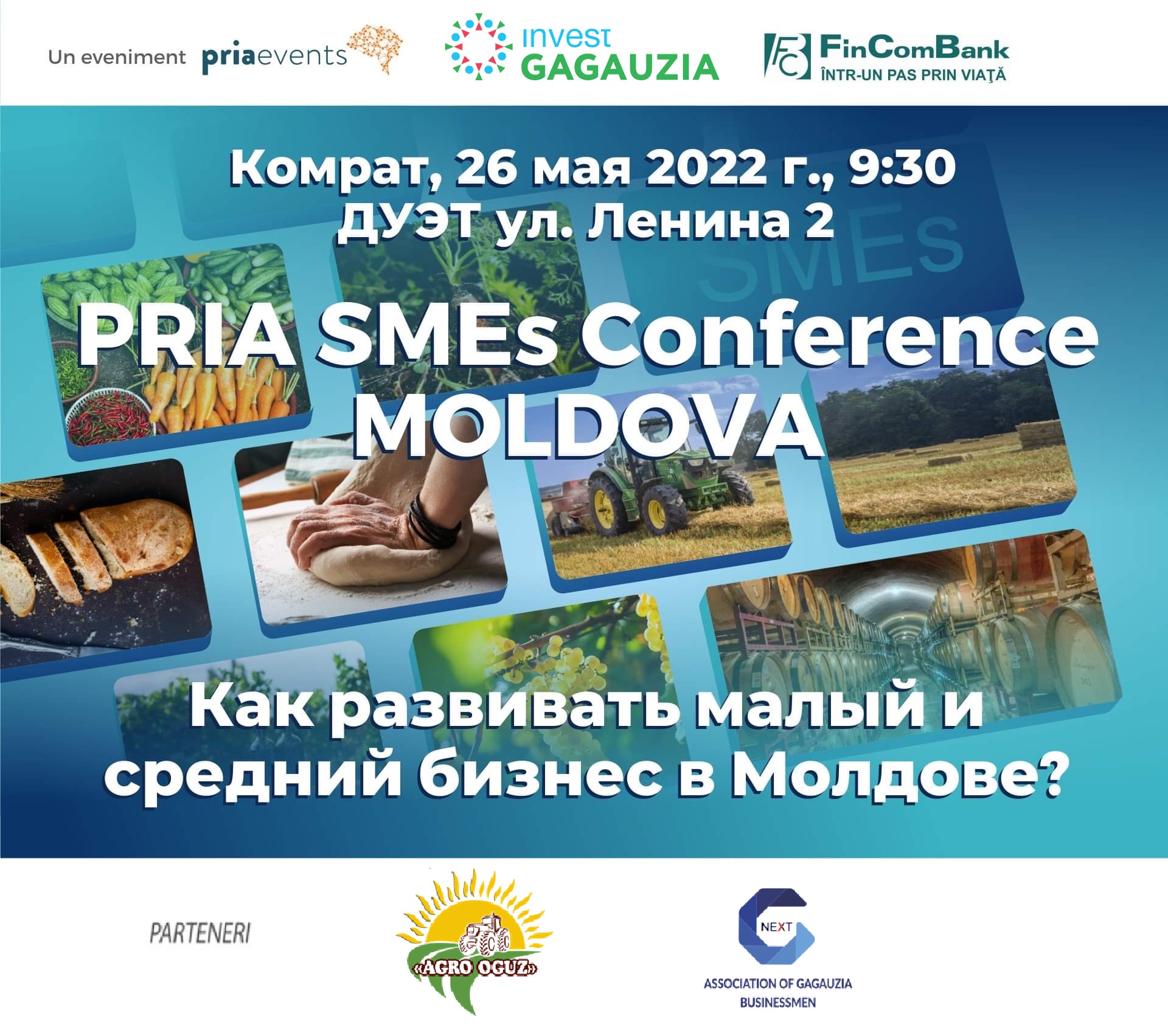 PRIAevents alături de INVEST GĂGĂUZIA și în parteneriat cu FinComBank, vă invită la conferința Pria SMEs Comrat – Cum dezvoltăm Întreprinderile Mici și Mijlocii din Moldova în Comrat, în 26 mai 2022, de la 9,30, la Duette în strada Lenin nr. 2.