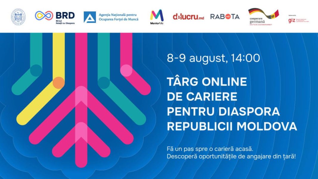 În 8 și 9 august va avea loc primul Târg Online de Cariere destinat exclusiv cetățenilor Republicii Moldova stabiliți peste hotare sau reveniți recent în țară. Evenimentul este gratuit, se va desfășura online, începând cu ora 14:00 (ora Moldovei), pe platforma www.carierediaspora.md.