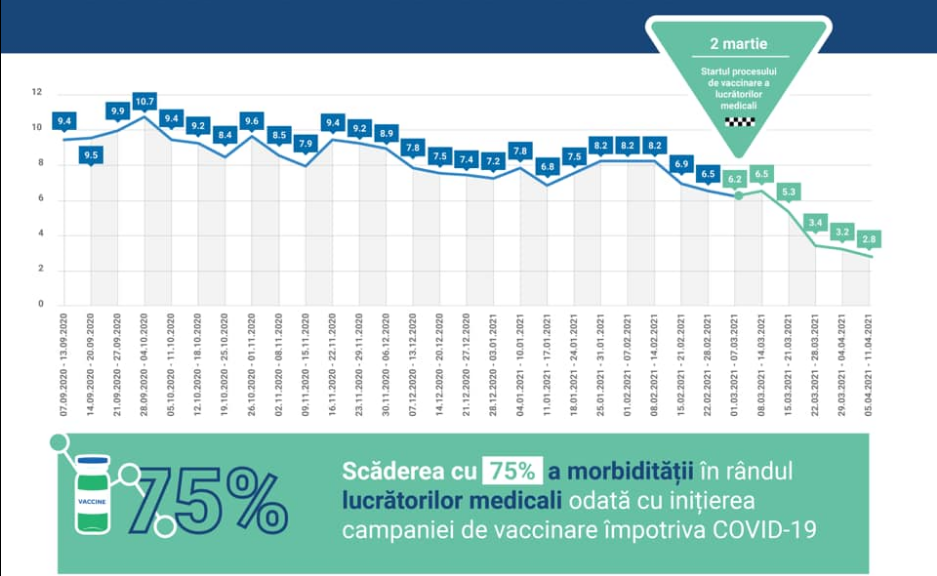 Astfel, dacă până la demararea campaniei de vaccinare, proporția lucrătorilor medicali infectați cu COVID-19, din numărul total de cazuri înregistrate, era de aproximativ 12%, în ultimele săptămâni ale campaniei de vaccinare, aceasta a scăzut la doar 3%.