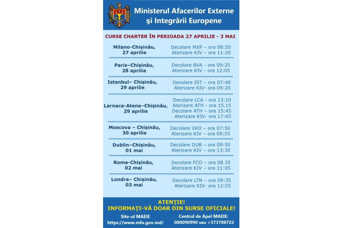 Conform orarului stabilit, în perioada 27 aprilie-3 mai, vor fi efectuate curse charter din Milano, Paris, Istanbul, Larnaca, Moscova, Dublin, Roma și Londra.